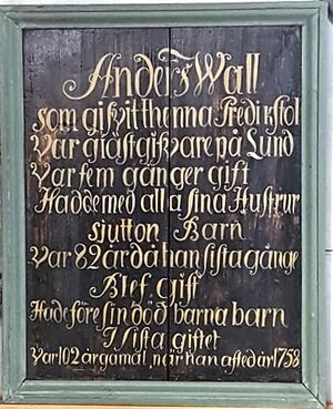 |''Anders Wall som gifvit thenna Predikstol var giästgifvare på Lund var fem gånger gift hadde med alla sina Hustrur sjutton Barn var 82 år då han sista gången blev gift hade före sin död barnabarn i sista giftet var 102 år gammal när han avled år 1758.'' |