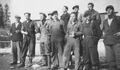 Gyltungebyns sågverks arbetsstyrka år 1951, från vänster Herman Magnusson?, Uno Skåån, Erik Eriksson, Karl-Erik Björqvist?, Rolf Skåån, Gustav Thulin?, Albert Blixt med hunden, okänd, Vendel Skåån, Sigfrid Blixt stående, okänd och ”Luse-Kalle”.