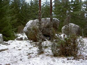 Igenvuxet i granskog planterad 1972. Växtspår: narcisser, krusbär, akleja, pärlhyacint. Källaren finns intill ett stort hål.[1]
