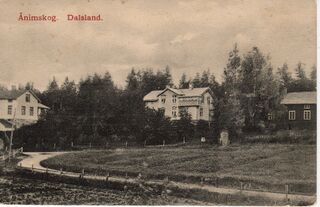 Vykort. Text: "Dalsland. Ånimskog". Vykortet ägs av Hans-Jürgen Koechling. Vy mot Fremlings gamla hus. Nord-väst ifrån stationen.