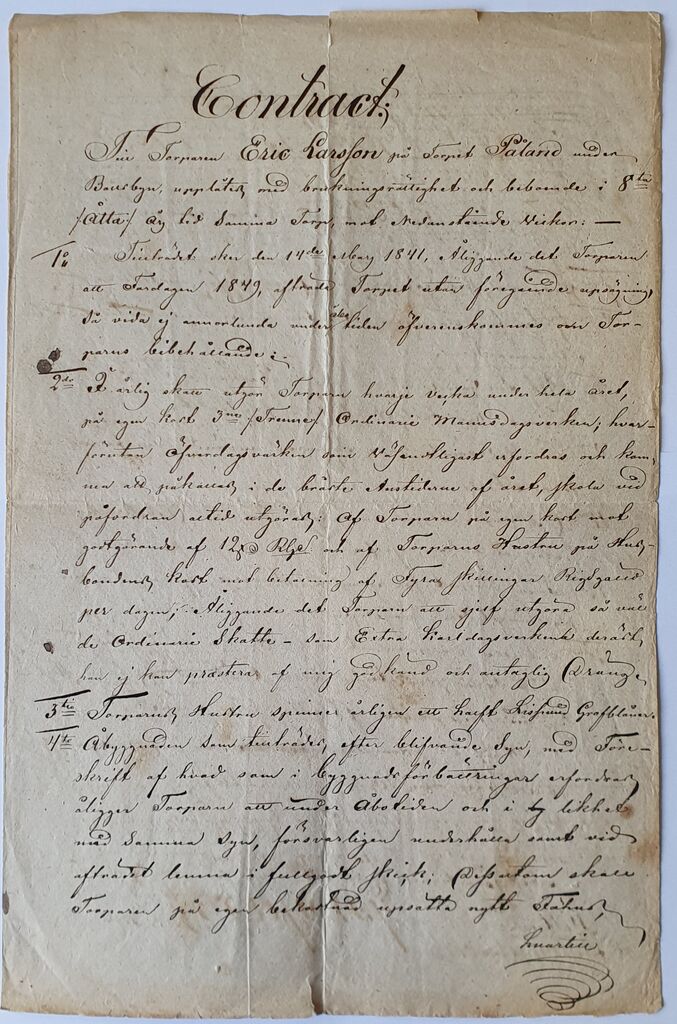 Torparkontrakt från 1840 under Bollsbyn Ånimskog, Pål eller Påland. Torpare Eric Larsson. Sid 1