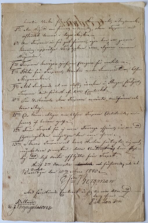 Torparkontrakt från 1840 under Bollsbyn Ånimskog, Pål eller Påland. Torpare Eric Larsson. Sid 2.