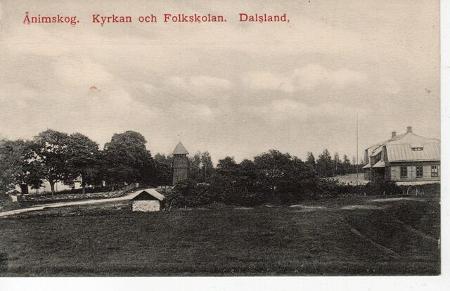 Vykort. Text: "Ånimskog. Kyrkan och Folkskolan. Dalsland.". Ca 1910. Vykortet ägs av Hans-Jürgen Koechling.