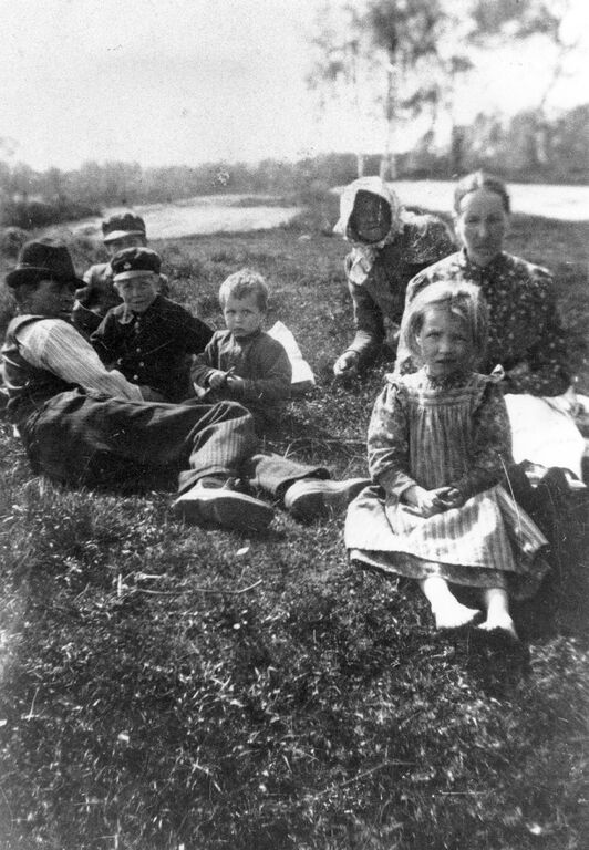 Aron Johansson och t.h. hustrun Matilda Johansdotter, parets barn Artur, Karl, Fritz och Elna. Med huckle, farmor Maria Olofsdotter, 1831-1910