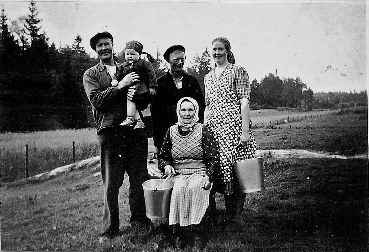 Mjölkdags: fr.v August Johansson och sittande hans fru Amanda, föräldrar till Frida som står till höger med sin make Carl-Eklöv. Barnet är okänt