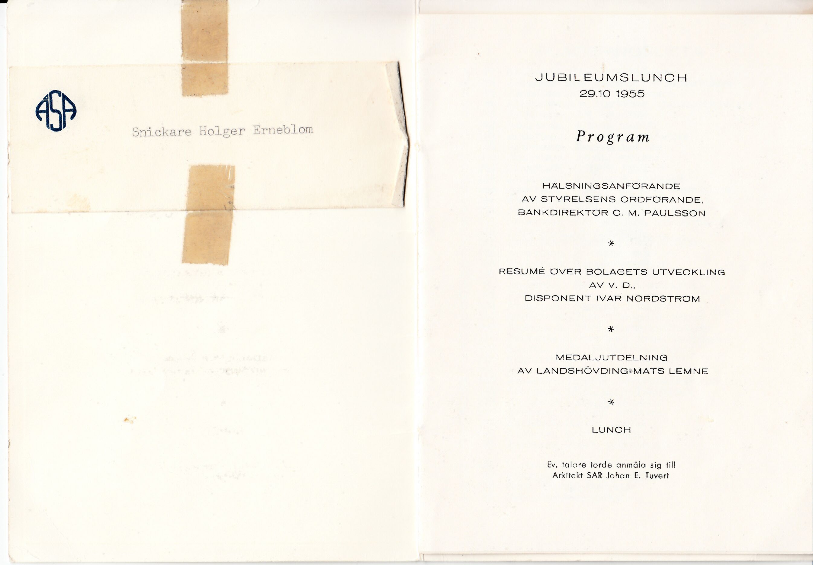 Dalsland Ånimskog Häfte från ÅSA-hus jubileumslunch 29 oktober 1955 med program, meny och placeringslista.