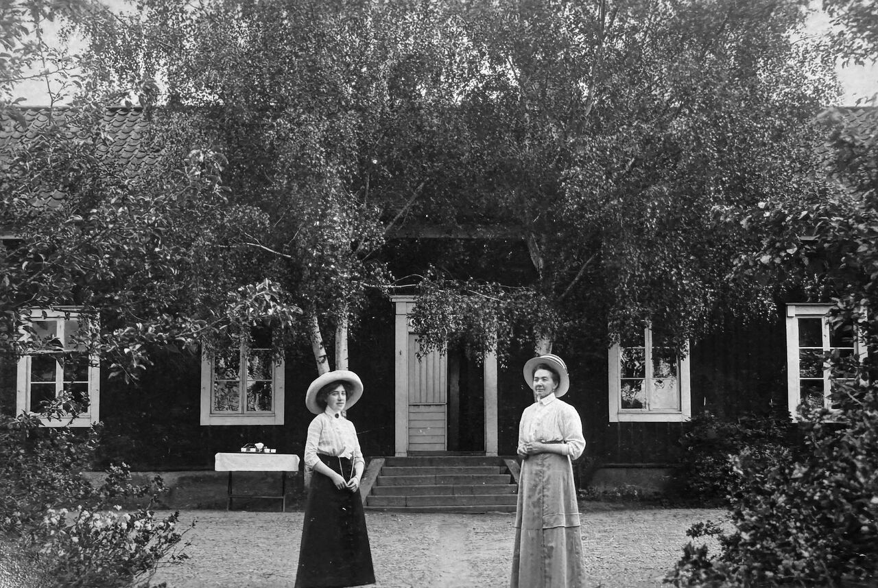 Staffansbo skola i Åsbo, fotovykort. Småskolelärarinnan Fru Leander till höger. Bilden ägs av Åsbo Hembygdsförening.