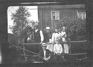 Dalsland Ånimskog Äskekärr, familj med häst framför en dalslandsstuga, bland annat Pontus Johansson och Ragnar Larsson på bild