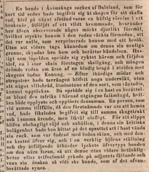 Efter ihärdiga mödor och strapatser hade terängen blivit noga undersökt, utan att något villebråd, åtminstone av den sort, som väntades kunna upptäckas.. Då spridde sig i en hast en berättelse bland den i härnad utgångne folkmängd, vilken både upplyste och upplöste densamma. En person , som vid samma tillfälle, då den förstnämnde var ute att hämta ved, hade likaledes begivit sig till samma skogstrakt och i samma ärende, men likväl olovligt. För att slippa bliva obehagligt röjd och anhållen, i denna sin kritiska belägenhet hade han hittat på sprattet att i hast vända sin rock som var fodrad med ludna skinn,, och med detta kastat över sig, och i verklig björns ställning och thy åtföljande åtbörder lyckades övertyga bonden om den nära faran, så att denne utan vidare betänkligheter eller tvivelsmål yrkade på odjurets fällande och vann sin önskan så att vidt ske kunde, som av den ovan berättade synes.