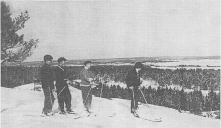 Utsikt från Kärrsdalsbergen mot Salebols skola. Fr. v. Erik Johansson Västerås, Hugo Karlsson Salebol, Bror Jo­hansson Västerås och Erik Persson Nedre Kilane.