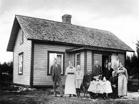 Ett foto på Resebacken eller ”Mor Skogs”, som vi sa’, när jag var liten och bodde på Norget. På bilden ser man fr.v. Oskar Skog, Anna King, f. Skog, Filip King, Anders August, 2x?, Maja Kajsa och Klara Skog. Fotot bör vara taget 1916-18 eftersom Filip här bör vara 10-12 år (f. 1906). Till höger om Anders står två personer, som jag inte har noterat namnen för, annat än att en skall vara Algot Skog. Min gissning är att det är Algot (f. -97) t.v och Frans (f. -01) t.h.